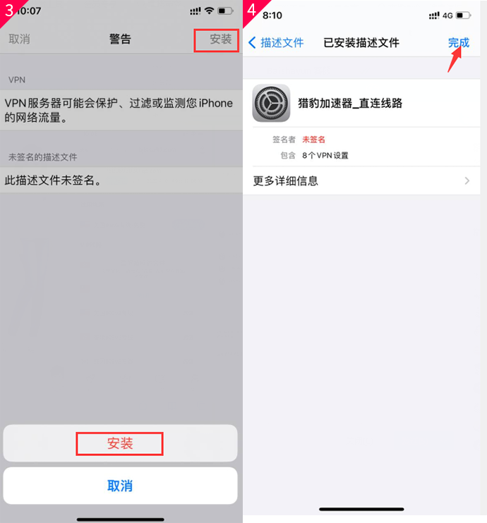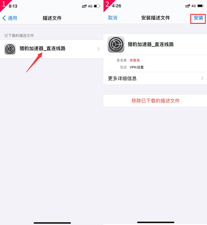1.进入加速器桌面,点击安装线路,然后允许。 2.进入手机设置,下滑找到通用选项,点击描述文件。 3. 安装描述文件;点击已下载的描述文件进行安装完成选项。 4.安装成功之后,返回设置界面点击VPN,选择测试线路点击连接即可使用。 您的浏览器不支持video播放